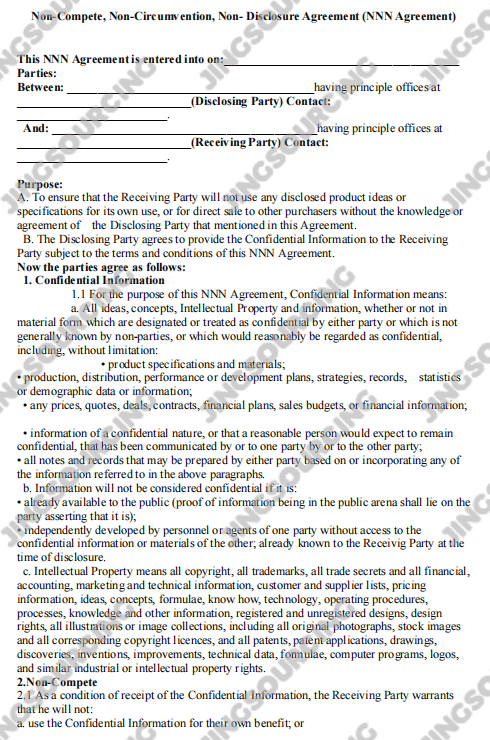 Some buyers, in particular big buyers, worry that cooperative partners or suppliers in China would disclose anything related to their business, such as the selling price and sales channels of products. This is another reason why an NNN agreement is requested. It binds suppliers not to disclose any shared business information.